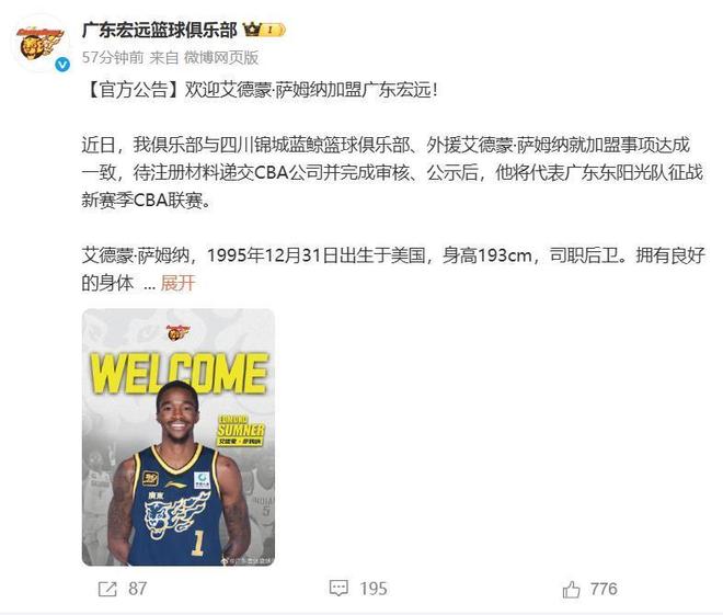 我们整个休赛期等待的萨姆纳终于来了!刚刚,广东宏远队官方宣布,上赛季效力于四川队的小外援萨姆纳加盟上赛季CBA最佳射手。目前,广东队的四名外援已经做好了新赛季的准备。球队整体实力较上赛季有明显提升。新赛季,杜锋和朱芳雨将带领球队实现队史第12座总冠军的目标。萨姆纳出生于1995年12月31日,身高1.93米,臂展2.06米,令人印象深刻。 2017年,他在第二轮第52顺位被新奥尔良鹈鹕队选中,然后被交易到步行者队。在NBA生涯中,萨姆纳曾效力于步行者队和篮网队。在NBA常规赛中,他总共出战161场比赛,场均贡献6.2分、1.5个篮板、1.1次助攻,投篮成功率47.0%,投篮命中率34%。平均 14.0 分钟的比赛时间里,三分球成功率为 0.1%。萨姆纳上赛季加盟CBA四川队,常规赛出战26场比赛,场均贡献36.0分6.6篮板6.8助攻2.1抢断,投篮命中率44.8%,三分命中率31.5%。今年夏天休赛期,多支球队都对萨姆纳表现出了兴趣,包括北京首钢队、北京商男篮、新疆队等,但只有广东队和朱芳雨坚持到底,与萨姆纳完成了续约。在此期间,萨姆纳多次宣布加盟广东队。看来他真的很喜欢广东队,也很想为广东队效力,所以今天这样的情况大家应该都感到高兴吧。广东队后防线得到补强,四川队获得大笔转会费优先续约权,萨姆纳离开心仪球队,创造双赢坐骑双方的评价。萨姆纳加盟广东队后首次接受公开采访。他表示:“我很兴奋能够加盟广东队,新赛季我唯一的目标就是赢球,夺得总冠军!”广东队球迷也不吝为萨姆纳点赞。据他们介绍,萨姆纳是上赛季CBA最矮的外援之一。据说他是最好的三名球员之一,也是最佳射手。他们相信他能够带领广东队再次夺得冠军。四川男篮副总经理霍楠更新社交媒体表示:“首先恭喜广东队成功击败萨姆纳,四川男篮也有可能回归,朱总的操作又快又准,希望这笔交易能够成为四川和广东俱乐部的双赢。”税前工资可达160万美元以上。与此同时,四川队声称要求支付200万美元优先续约权转让费。最终的谈判结果可能不会那么好,但应该不会低于150万美元(1000万元人民币)。因此,广东队收购萨姆纳所付出的代价非常高,预计在350万美元左右(折合人民币约2500万元)。不过,广东男篮今年获得了全国锦标赛冠军,广东队还获得了数亿美元的支持资金。如果有机会夺得队史第12个总冠军,这笔钱就值得花。萨姆纳今年还不到30岁,正处于职业生涯的巅峰期。他身体状况良好,有丰富的比赛经验。他体力好,速度快,冲击力强,有很强的个人能力和带球终结能力,在防守区内也有良好的组织和分球能力。判断 fr从上赛季四川队的数据来看,萨姆纳的技术非常齐全,防守姿势也非常好。广东队和朱芳雨花费数百万美元收购它是有原因的。新赛季广东队的首发阵容预计为胡明轩、崔永熙、焦伯桥、苏林格和萨姆纳(或奎因)。新赛季,广东队纸面阵容扎实,具备争夺冠军的充分条件。