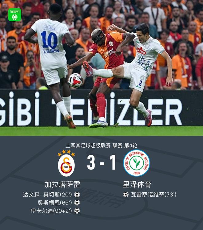 8月31日,北京的时间在土耳其足球超级联赛的第四轮比赛中对阵Rize Sports。在游戏中,加拉塔萨雷(Galatasaray)在达文森·萨恩奇斯(DavinsonSánchez)开业,奥斯蒙(Osmeon)扩大了领导力,瑞泽(Rizer)体育赢得了瓦尔萨诺维奇(Valesanovic)的比赛。随着比赛的结尾,伊卡迪(Icardi)赢得了另一场比赛,确保了加拉塔莱(Galatasarai)的胜利。最后,加拉塔萨雷(Galatasaray)以3-1击败对手,赢得了三分。在关键赛事的20分钟内,达文森·萨恩奇斯(DavinsonSánchez)在第65分钟领先1-0球,瓦尔达尔克克(Valdarkick)在第73分钟以2-0和2-0的成绩击败了奥斯曼(Osmen),而加拉塔(Galata)的叶子在背景上拦截。将球推到一个空洞的进球,这是在加拉塔·萨利尼(Galata Salei)3-1中的绝佳时刻,双方的队长迅速在第20分钟开始比赛,达文森·萨恩奇斯(DavinsonSánchez)领导了埃斯贝比(Esbeby)团队第18米纳特罗(Esbeby Team)第18米特罗(Minutero)的加拉塔·萨利尼(Galata Salei),在第65分钟再次飞行,当时他的队友越来越多。 Varesanovic在入口90 + 3分钟以阻止胜利,伊卡迪(Icardi)推了球以取得空洞的进球。