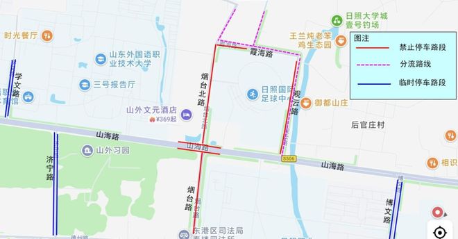 关于10月18日齐鲁中超比赛期间实施交通管制措施的通知 10月18日,2025年山东齐鲁足球超级联赛将在日照国际足球中心举行。为保障赛会期间道路交通安全有序,公安机关交通管理部门将依据《中华人民共和国道路安全法》等法律法规,对比赛场馆周边部分道路实施临时交通管制措施。 1. 管制时间为下午 2:30 起至晚上 10:30 2、2025年10月18日星期六,烟台北路(山海路与烟台路交叉口以北)—霞海路—灌云路—山海路、山海路(济宁路—博文路)、烟台路(山海路—学院路)路段实施临时交通管制措施。三、监管措施 (一)停车管理服务措施 1、标准国王摊位是禁止的。 2025年10月18日14时30分至22时30分,烟台北路(山海路至下海路)、烟台路(山海路至聊城路)、观云路等路段禁止其他车辆(含非机动车)停车,经组委会批准在赛事中使用的特种车辆除外。 2. 允许停车。从下午 2:30 开始至晚上 10:30 2025年10月18日起,烟台路(聊城路以南)、德州路、聊城路、博文路、济宁路、学文路、学院路等道路两侧允许车辆临时单列停车。 (二)交通管制措施 1、下午2点30分起至晚上 10:30 2025年10月18日起,烟台北路(山海路-下海路)仅允许公交车通行,其他社会车辆(不含非汽车)不得进入烟台北路(山海路-下海路)。 2、10月18日14:30至22:302025年,山海路(博文路至集宁路)、烟台路(山海路至学院路)、霞海路、灌云路等路段将根据实际交通情况,及时实施机动车、非机动车、行人绕行、限行、禁止通行等交通管制措施。高峰时段观众进出场馆的交通状况。四、出行温馨提示 1、活动场地周边道路交通拥堵。日照公交将增加常规线路,开通2条球迷专用线路和2条连接无人驾驶停车场的微循环线路。为避免交通拥堵和停车位困难,我们建议您尽可能选择公共交通或环保出行。 2、活动期间山海路、烟台路、烟台北路、灌云路、集宁路、博文路等路段交通繁忙,容易出现交通拥堵。请广大市民提前组织出行,合理规划出行路线,尽量避开交通限制区域,自觉遵守交通法规,听从执勤交警指挥。 3、公安交通管理部门届时将启动导航服务。关注高德、百度等导航系统,及时了解交通法规、附近停车信息。 4、警车、消防车、救护车、急救车可以出入与交通管制、应急、安保车辆、能源、通讯、环境卫生等服务相关的区域。 5、公安交通管理部门将根据事件实际情况适当调整交通管制措施。我们会在这里通知您。日照市公安局交通管理大队2025年10月15日来源:日照市交通警方微信公众号 编辑:徐锐 审稿人:彭婷 导演:王宗敏 所有信息均在“日照日报视频号”